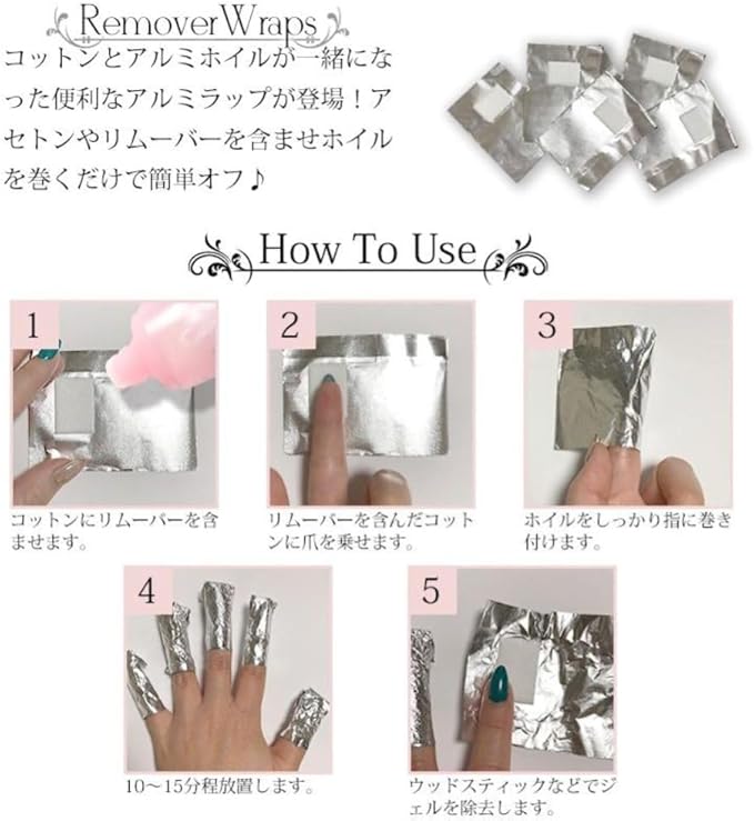 【仕様方法】ファイルでジェルの表面に傷をつけます。 リムーバーラップにリムーバーをしっかりしみ込ませます。 リムーバーラップをしっかり指に巻きつけます。 10分~15分放置します。 ウッドスティックでジェルを剥がします。 乾いた爪を保湿するためキューティクルオイルを塗り完了です。