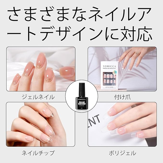 TOMICCA剥がせるベースジェルは無臭であり天然樹脂,刺激臭がない,9つの有害物質を含まず、ビーガンでクルエルティフリーで、快適なマニキュア体験を提供します。剥がせるジェルネイル ベースを使用すると、リムーバー不要。