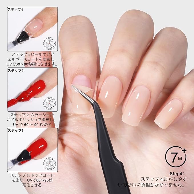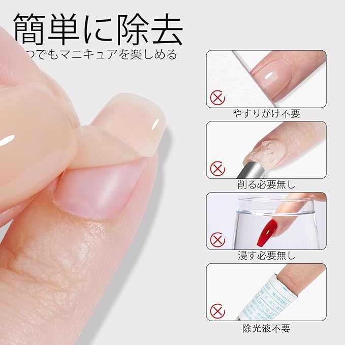 使いやすい:爪の表面をクリーニングします、剥がせるベースコートを塗っ、UV LEDネイルランプで60〜90秒で硬化します。剥がすときは、ピンセットを使ってジェルポリッシュの角をそっと持ち上げ、ゆっくりと剥がします。ジェルを剥がした後のベタつきがほとんど残らないので、綺麗にオフできます。