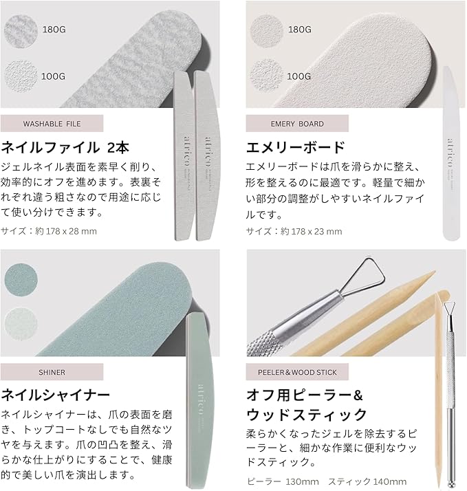 【セット内容】・ジェルリムーバー100ml ・ネイルファイル100/180(ジェルを削る用途のファイル) 2本・エメリーボード(爪の長さや形を整える用途のファイル) ・ネイルシャイナー(爪の表面に光沢を与える用途のファイル)