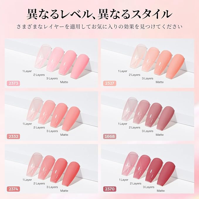 ジェルネイル 透け感:薄く塗るジェルネイル、ゼリーのようなみずみずしい透明感。厚塗りや2~3度塗りでしっかり発色。塗り方や塗布量を変えて、お好みのカラーに仕上げることができます。通学、結婚式、イベント、入学式、オフィスと日常など様々な場面に、ごキラキラ可愛いに
