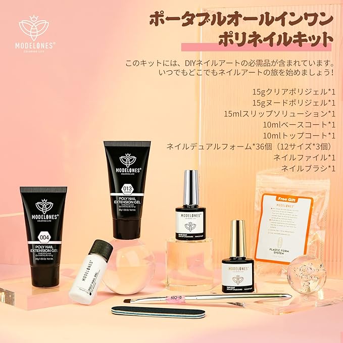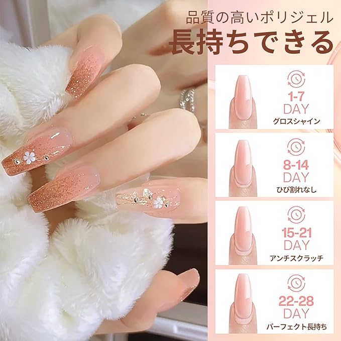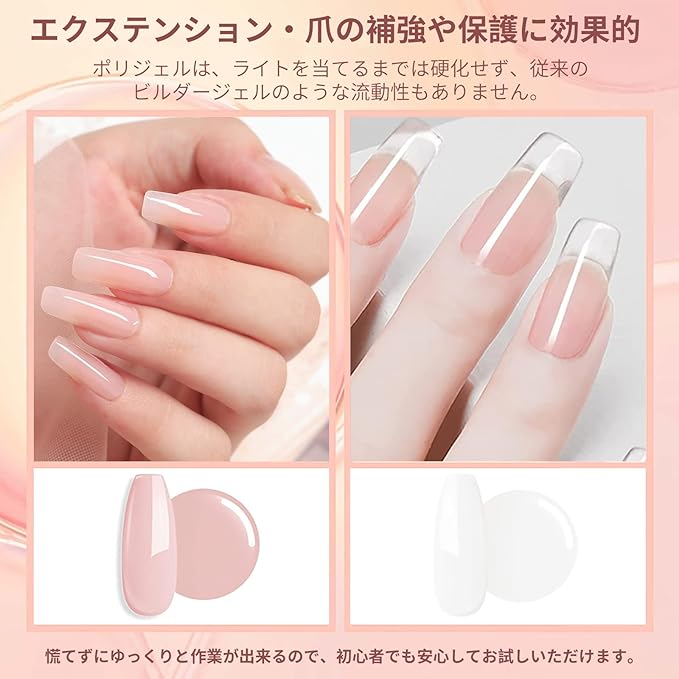 セット内容:このポリジェルセットには、15 g * 2本の長いだしジェル、スリップソリューション、ベースとトップコート、ネイルツールが含まれており、ネイルサロンや自宅のDIYに最適です