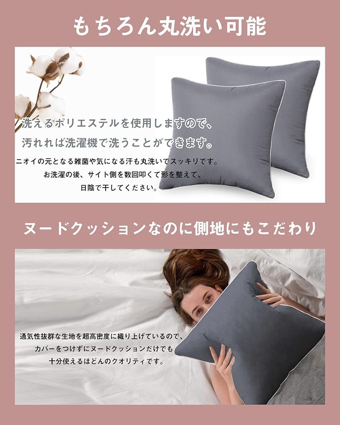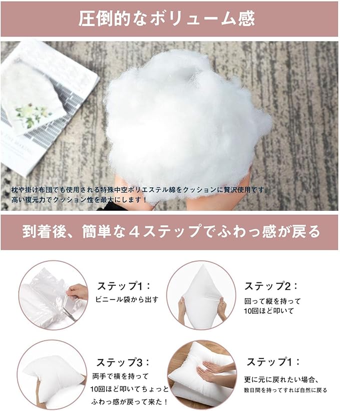「ホテル級!ふんわり気持ちいい」 素材がポリエステル100%で、通気性と吸湿性が優れて、肌に優しい敏感肌にも大丈夫です。グーッと沈みこむようなしっかりとした弾力があり、寄りかかった時に安定感があります。座布団として使っても、従来のクッションより底付き感がないので、お尻が痛くならないと感じる方も多くいます。長期間使用しても型崩れが起きにくいです。*商品には個体差があります。複数個ご注文いただく場合は、ボリューム感やにおいなどにそれぞれ違いがある可能性がございますことを、あらかじめご了承くださいませ。