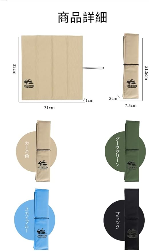 【仕様&材料】 広げた状態:約32 32 1cm。折り畳んだ状態:約32 8 3cm。重量:約115g。折り畳みクッションの表面は高品質の防水ポリエステル製です、中間充填物は発砲ポリエチレン緩衝材。防水性、防湿性、断熱性、通気性、耐久性、クッション性に優れていますので。色褪せしにくい、水洗いもできるので汚れてしまっても安心。