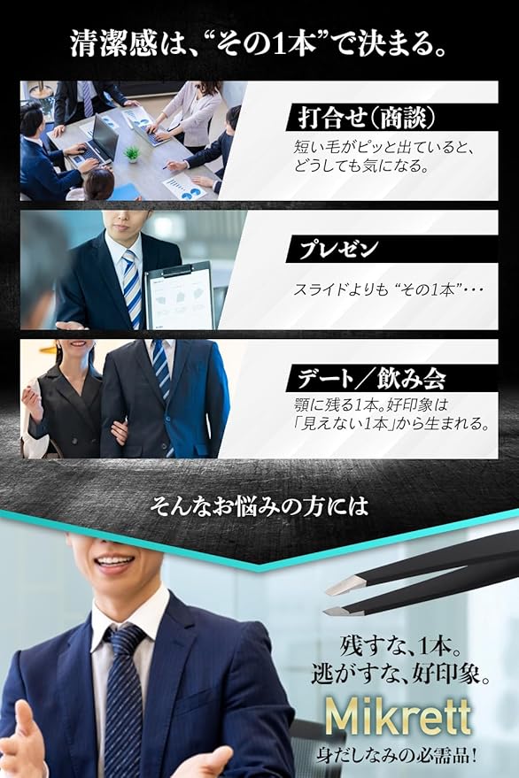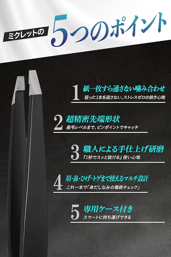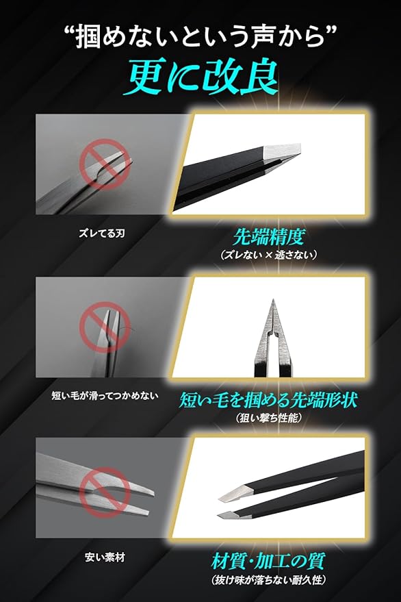 ✅ 短い毛・細い毛も逃さない超精密先端 産毛レベルの短い毛・細い毛でもピンポイントで掴める先端形状。 「つかめない」「滑る」といったストレスを大幅に軽減します。