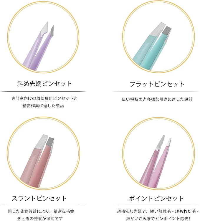 【プロ仕様 毛抜きピンセット4種セット】斜め先端・ストレート先端・角度付き先端・尖った先端を厳選収録。眉シェイプから埋没毛処理まで、毛抜き作業のプロフェッショナルを徹底サポート。耳毛抜き用としても最適な細やかさ。