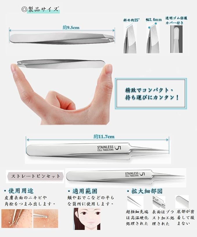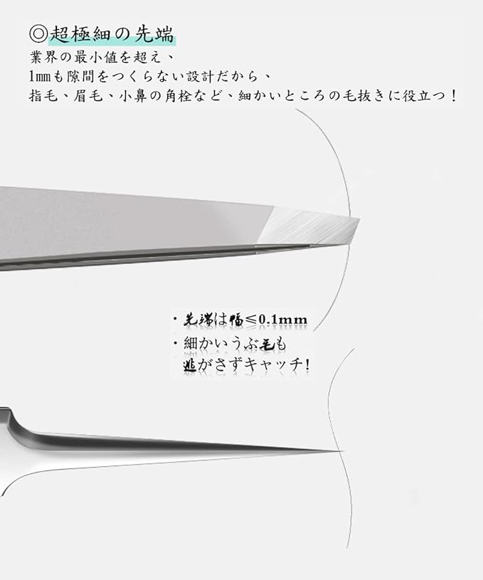 【超極細の先端】ドイツの精工技術を採用されており、業界の最小値を超え、角栓ピンセットの先端幅は0.1mmです。毛抜きピンセットは超薄型の先端を持ちます、業界トップ!「安全に保管できるため、先端にはめるキャップがついています」