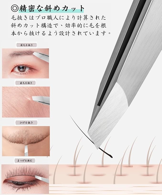 【かみ合わせピッタリ】細かく調整された先端を、手作業で磨き、隙間なくしっかりと咬み合わせ、お肌にやさしい刃先へと仕上がっています。また、お肌にだけではなく、抜く毛にも優しい刃先で、細かなうぶ毛も途中でちぎれることなく、スッと抜くことができます。