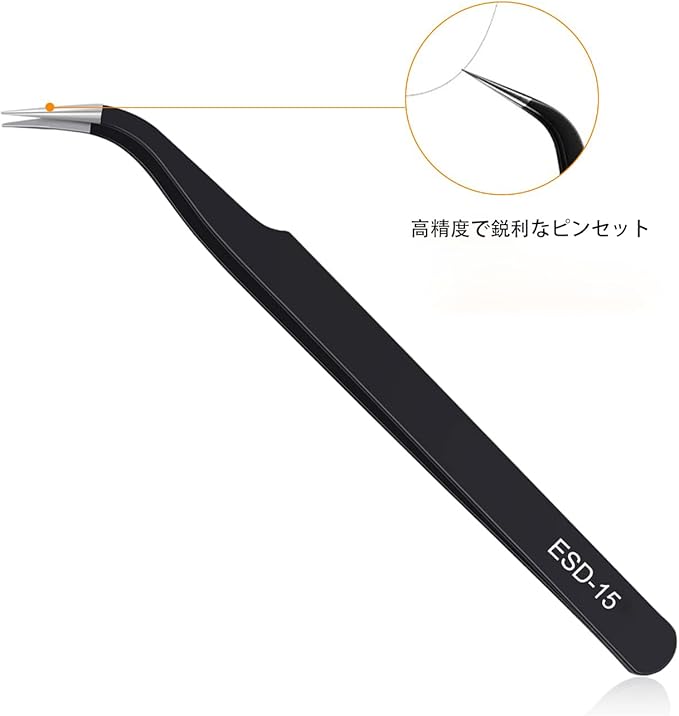 ピンセット[ESD-15]:先曲タイプ、狭い場所での作業に使える(124mm/4.88in)。