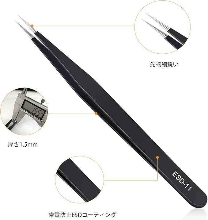 ピンセット[ESD-11]:直型、刃先は標準型のESD-10より細鋭いです (140mm/5.5in)。