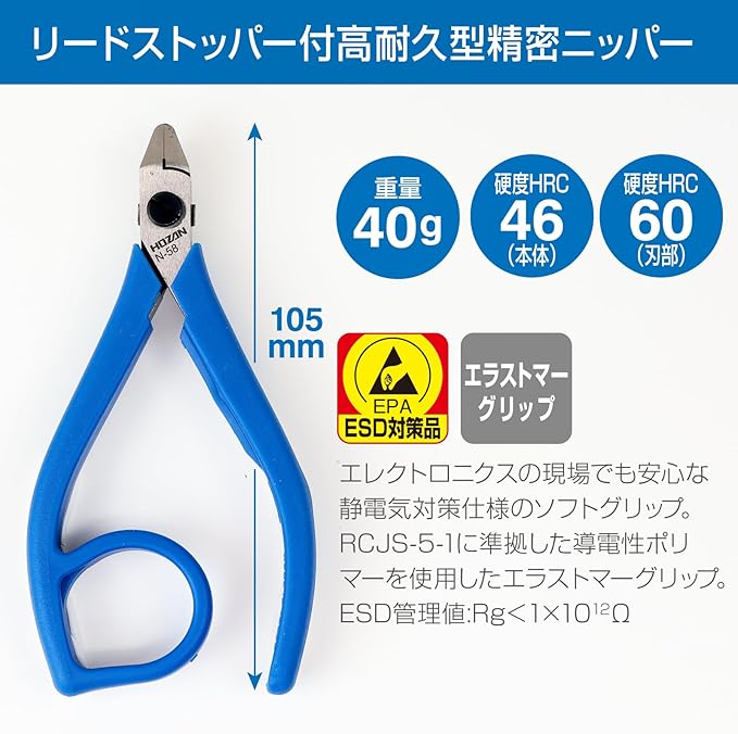 【切断能力】銅線:0.18~0.8mmφ(リードストッパー有効範囲)【硬度HRC】本体:46、刃部:60【ESD管理値】Rg<1 10^12Ω【重量】40g【全長】105mm【用途】電子部品・細い電線・金属線の切断、電子機器や精密機械の組み立て・修理、電子工作、プラモデル・模型・アクセサリーの製作、ワイヤーワーク、釣り針の製作や修理、手芸・ビーズワーク