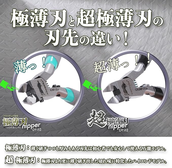 極薄に仕上げられた片刃構造のプラスチック切断専用ニッパー。 薄く繊細に研ぎ出された刃先は通常のニッパーよりも美しくゲートを切断可能です。切れ味の良い極薄片刃が片方から真っ直ぐ切断することにより プラスチックの白化も少なく切断後のヤスリがけ作業も大幅軽減、作業効率大幅アップ。