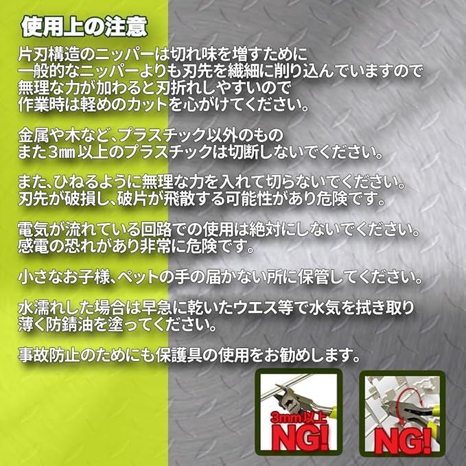 【片刃ニッパーまな刃について】 薄く研がれた切断刃の刃折れを防ぎ、スムーズに最後まで切るために 切断刃よりまな板刃がごく僅かに張り出した作りになっています。 不良などではなく商品の仕様であることをご理解ください ※切断刃を対象物に沿って切ることでほぼフラットに切ることが可能です