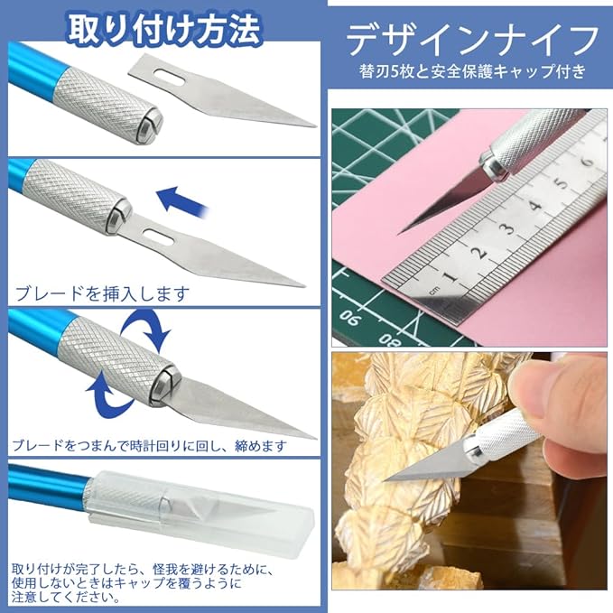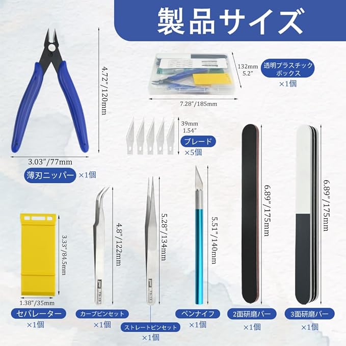 各種ツールキット: パッケージ内容: 1 x ニッパー; 2 x ピンセット; 1 x ファイル; 2 x 両面ポリッシュバー; 1 x ペンナイフ; 1 x 5個のスペアブレード; 1 x クリアボックス。