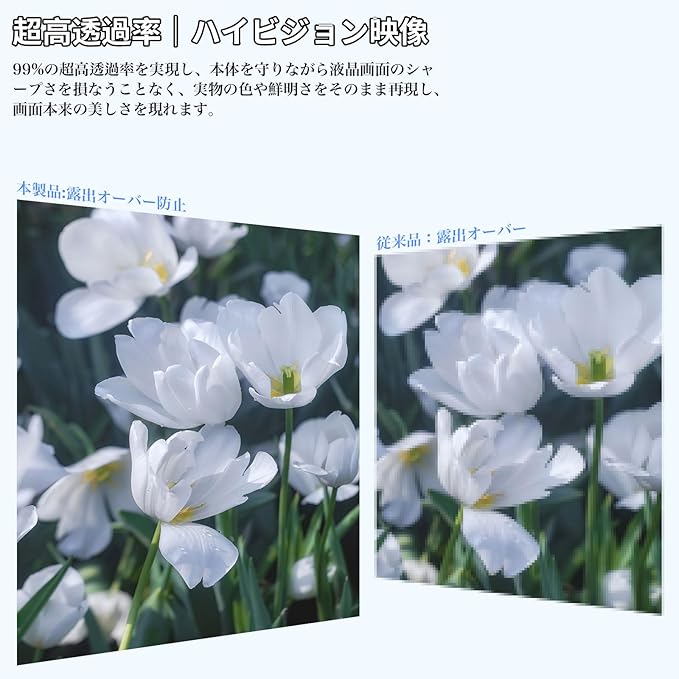 【99%透過率】最高級のガラスを使用し、透過率99%の透明度を実現し、液晶本来の鮮明な画質を損なうことなく液晶画面を守ります。フィルムを装着しても使用に支障をきたすことなく、スマートフォンの安全を守りながら快適な体験をお楽しみいただけます。