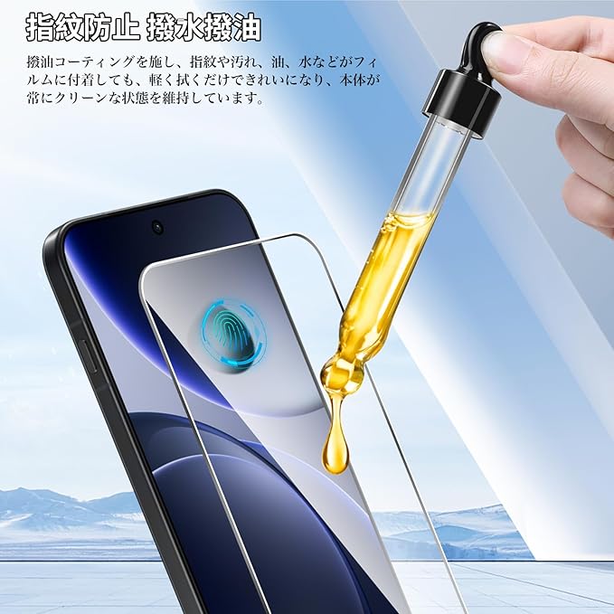 【汚れに強い】撥水・撥油加工が指紋や皮脂の付着を防ぎます。フィルムの表面には様々な特殊加工が施されており、油分、ほこり、指紋に強く、スマートフォンを常に清潔な状態に保ち、見た目の美しさや画面体験にも影響を与えません。頻繁にスマホを拭かないようにします。