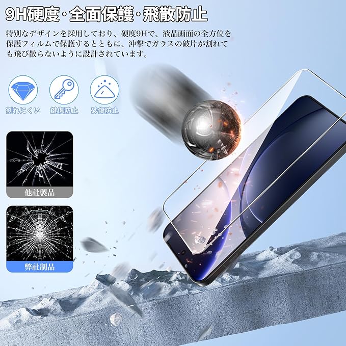 【9H硬度】日本製旭硝子材料を採用し、外部からの沖撃に強く、スマートフォンの画面への沖撃を防ぎます。また、特殊な飛散防止設計により、フィルムが割れても飛散せず、高い安全性を実現しています。スマートフォンを全面的に保護し、液晶画面の安全を守り、長く安心してお使いいただけます。