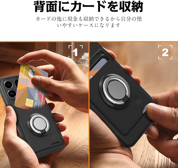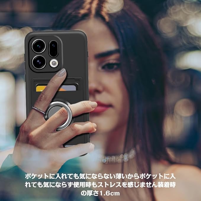 対応 OPPO Find X9 OPG07 ケース カード収納 リング付き シリコン オッポファインドx9 スマホケース スタンド機能 360 回転リング 耐衝撃 滑り止め 黑