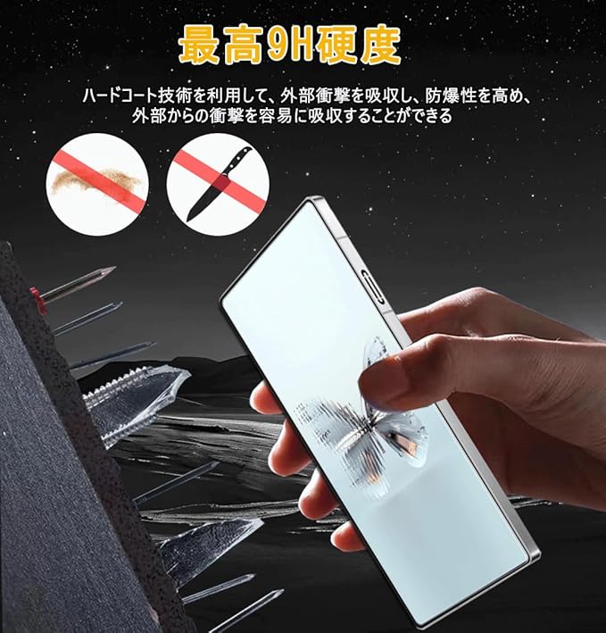 【疎水性・撥油性抜群・飛散防止】フィルム表面はハードコート加工、オイルコート加工、平滑接触加工など様々な特殊加工を組み合わせており、油分、ホコリ、指紋への抵抗力が非常に強い。9 H硬度ガラスは、耐久性に優れ、鋭利な物体による衝撃を緩和し、画面の破損を抑制する。内蔵シリコンコーティングが衝撃を緩和。万一ガラスが破損した場合、スクリーンを保護し、ガラスが飛び散ってけがをしないようにすることができます。
