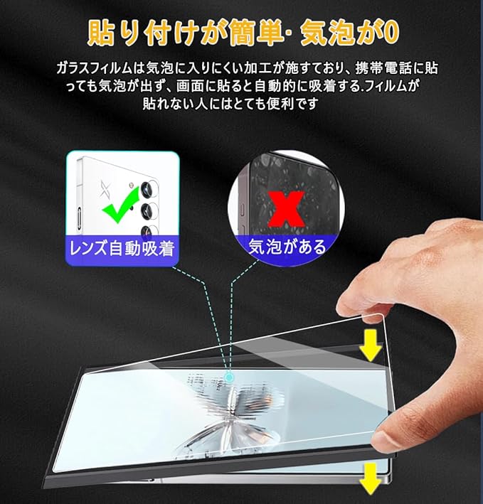 【簡単貼り付け】フィルム接着面の吸着力の強いシリコンコーティングを採用し、静電吸着設計し、自動吸着できる。これならフィルムが苦手な人でも簡単に貼ることができ、位置を合わせて上から軽く置くだけで気泡が入らず簡単に取り付けることができます。