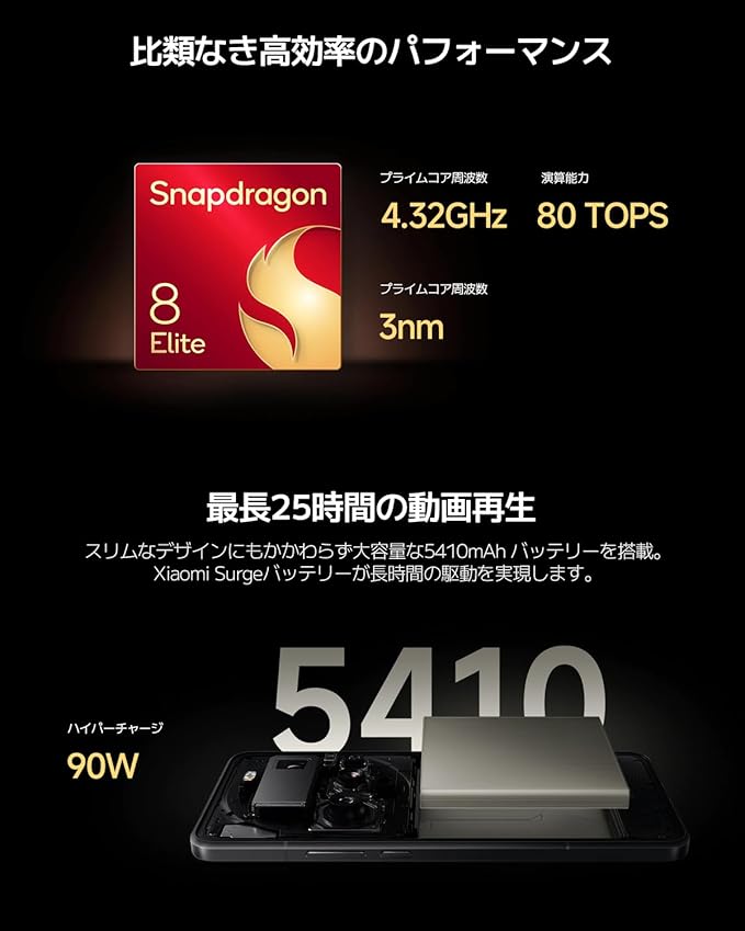 ✅フラッグシップの処理性能:3nm製造プロセスとOryon CPUによる業界最先端のSnapdragon 8 Elite Mobile Platformを搭載しており、前世代と比較してCPU性能を45%、GPU性能を44%向上させました。消費電力と日常のバッテリー持続時間のバランスを両立し、素晴らしいパフォーマンスを発揮します。