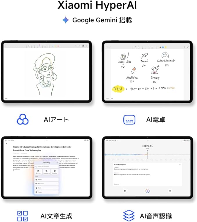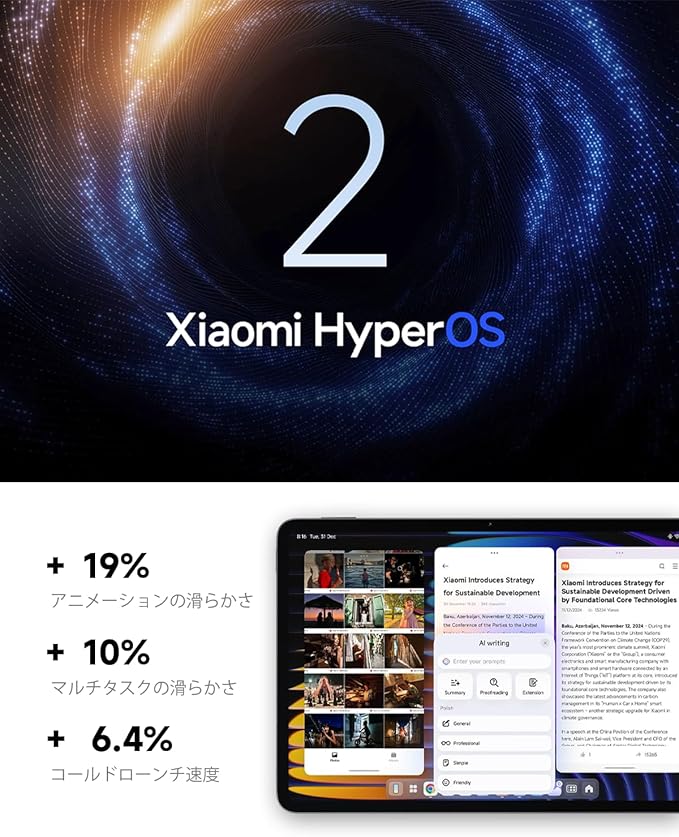 【Xiaomi HyperAI】Xiaomi Pad 7は、Snapdragon 7+ Gen 3 Mobile Platformを搭載し、学習とエンターテインメントのバランスを求める人のために設計されています。外国語のリアルタイム翻訳や要約といった日常の利用のみならず、手書きの数式を認識して計算するAI電卓や自分で描いたイラストをもとに生成するAIアートのようなタブレットに最適化したAI機能もご活用いただけます。