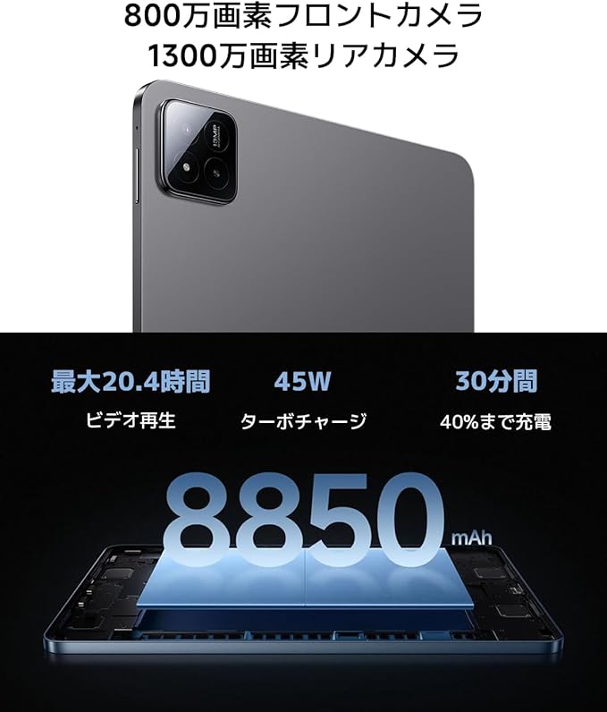 【フラッグシップ並みのパフォーマンス】Xiaomi Pad 7は、Dolby Atmos対応のクワッドスピーカーを内蔵しており、200%の音量アップをサポートしているため、さらに没入感のあるサウンド体験が得られます。Xiaomi Pad 7シリーズは厚さ6.18mm、重さ500gの薄型軽量ボディに8850mAhの大容量バッテリーを搭載。45W 急速充電に対応するため、万が一充電がなくなても、すぐに回復します。メタルユニボディ設計は従来モデルにあるディスプレイの出っ張りをなくし、よりスタイリッシュなデザインを実現。