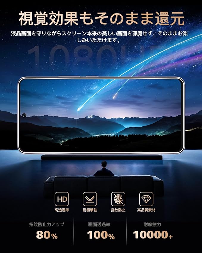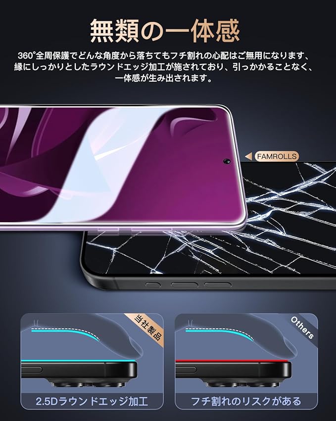 【9H硬度 飛散防止】スマホフィルムとレンズ保護フィルムはすべて旭硝子で作られており、スマホ保護フィルムの中で高レベルの9H硬度に達しています。手にフィットして持ちやすく滑りにくいので落ちにくいです。万が一落ちてもフィルムが衝撃を吸収してくれるので、スクリーンの損傷を低限まで抑えられます。また、特殊な飛散防止設計により、ガラスが割れても飛散しないため。
