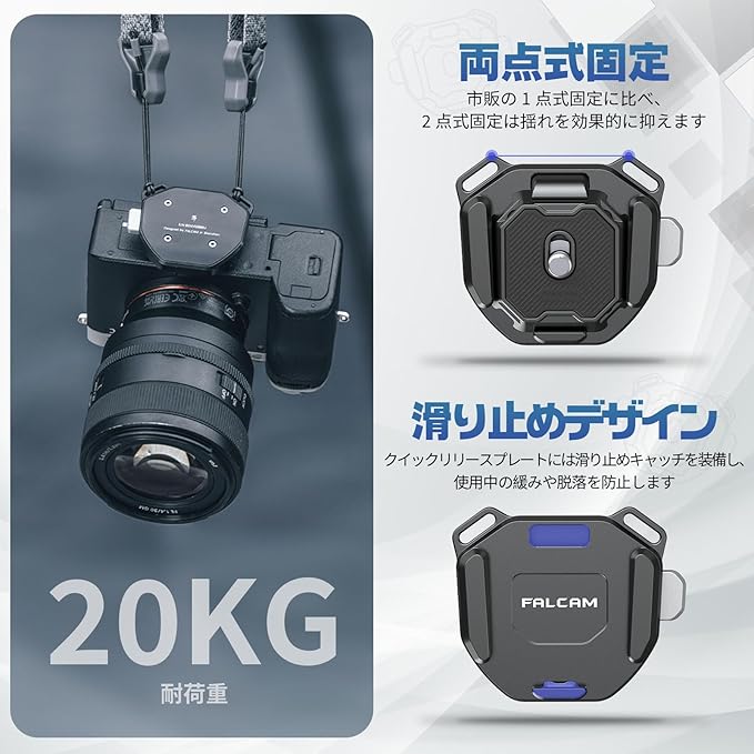 【滑り止めデザイン】両点式固定 :市販の1点式固定に比べ、2点式固定は揺れを効果的に抑えます。クイックリリースプレートには滑り止めキャッチを装備し、使用中の緩みや脱落を防止しますそれに、表面には新升級一体化滑り止めのシリコンがあり、カメラとの摩擦接触面積を増加させ、ずれを防ぐと同時にカメラを保護することができます。