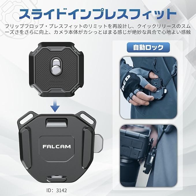 【幅広い互換性】F38クイックリリースショルダーストラップタイプV2のプレートは他のF38クイックリリースベースと互換性があるだけでなく、ショルダーストラップとも互換性があります。カメラを縦位置に構えた時にストラップが邪魔にならないで、ストラップに装着した時レンズが下向きになるんで、傷つきにくいです。カメラやショルダーストラップを外す必要がなく、ワンクリックでロックが解除されます。F38クイックシューは元の版本と違い、市販のほとんどのArca規格に対応でき、アルカスイス規格の三脚の雲台との互換性も高いです。完全に自由なクイックリリースを体験することができます。*注意:クイックリリースベースの互換性を高めるため、プレートを取り付ける際に多少の音がしますが、これは正常な現象です。