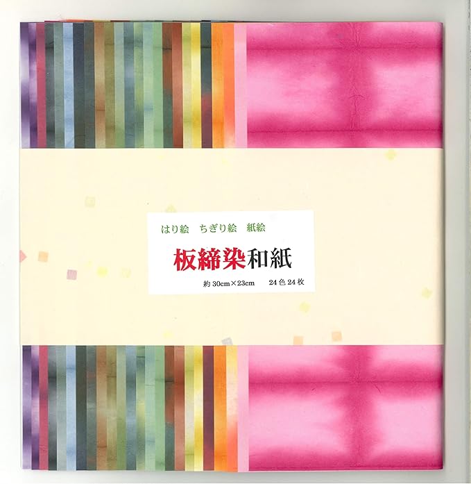 和紙の寸法は、約30cm 23cm 24色24枚入りのセットです。 手芸用、ちぎり絵、はり絵などに最適です。 板締染とは、 織物では夾纈(きょうけつ)と呼ばれ、奈良時代からの染め方で、これを和紙に応用したものです。 製法は、和紙を何回も望みの形に、大きくあるいは小さく折りたたみ、板の間にはさんで、ひもでくくり、板からはみ出した部分だけを染液に浸して染めます。 たたみ方によって様々な模様が現れ、またぼかし模様も染め出すことができます。 板をひもで締めつけた圧力が防染作用をするので、染料は不規則に和紙に滲み、ぼかしの効果が現れます。