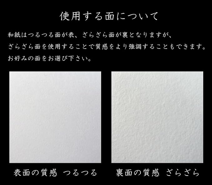 【和紙の表裏について】 一般的に表がつるつる面、裏がざらざら面とされておりますが、質感を強調するため裏面をご使用いただくことも可能です。お客様のお好みの面をお選びください。