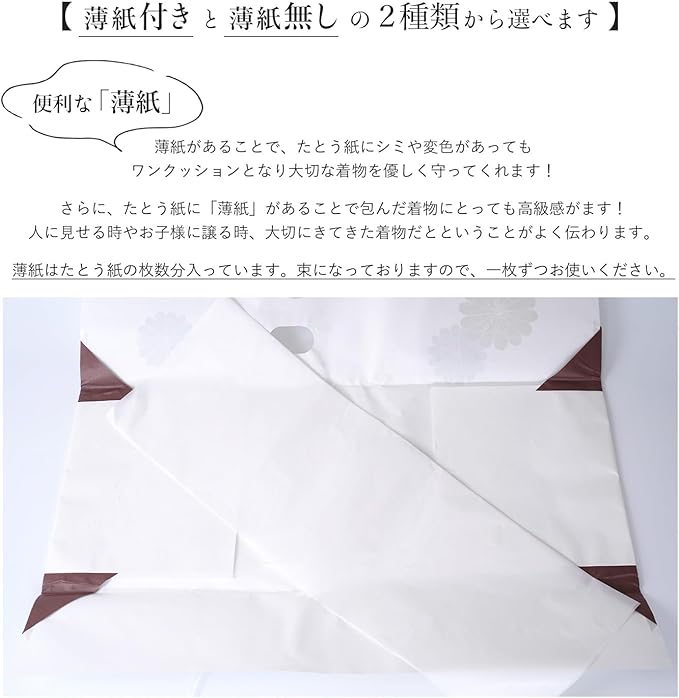 【薄紙ありと薄紙無しの2種類】薄紙があることで、たとう紙にシミや変色があってもワンクッションとなり大切な着物を優しく守ってくれます!さらに、たとう紙に「薄紙」があることで包んだ着物にとっても高級感がます!人に見せる時やお子様に譲る時、大切にきてきた着物だとということがよく伝わります。薄紙はたとう紙の枚数分入っています。束になっておりますので、一枚ずつお使いください。