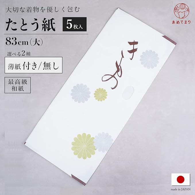 [あめてまり] たとう紙 5枚セット 着物 大 和紙 標準(大)サイズ 83cm 金菊柄 [選べる 中紙あり 無し] 日本製 薄紙 雲龍紙 窓付き 収納 文庫紙 たとうしがみ 畳紙 多当紙 ロング 着物 和ダンス用 (薄紙あり)