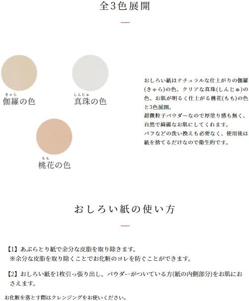 おしろい紙はナチュラルな仕上がりの伽羅(きゃら)の色、クリアな真珠(しんじゅ)の色、お肌が明るく仕上がる桃花(もも)の色と3色展開しています。