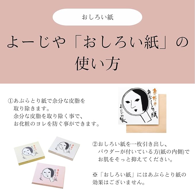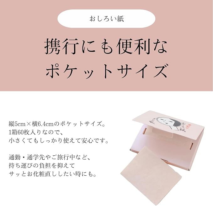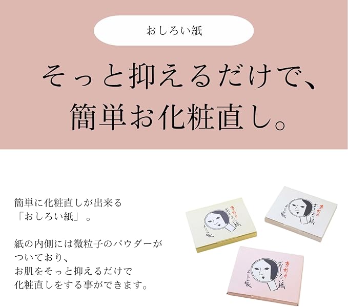 肌のあぶら浮きや化粧崩れが気になった際に、おしろい紙を肌にそっと抑えるだけで簡単にお化粧直しができます。