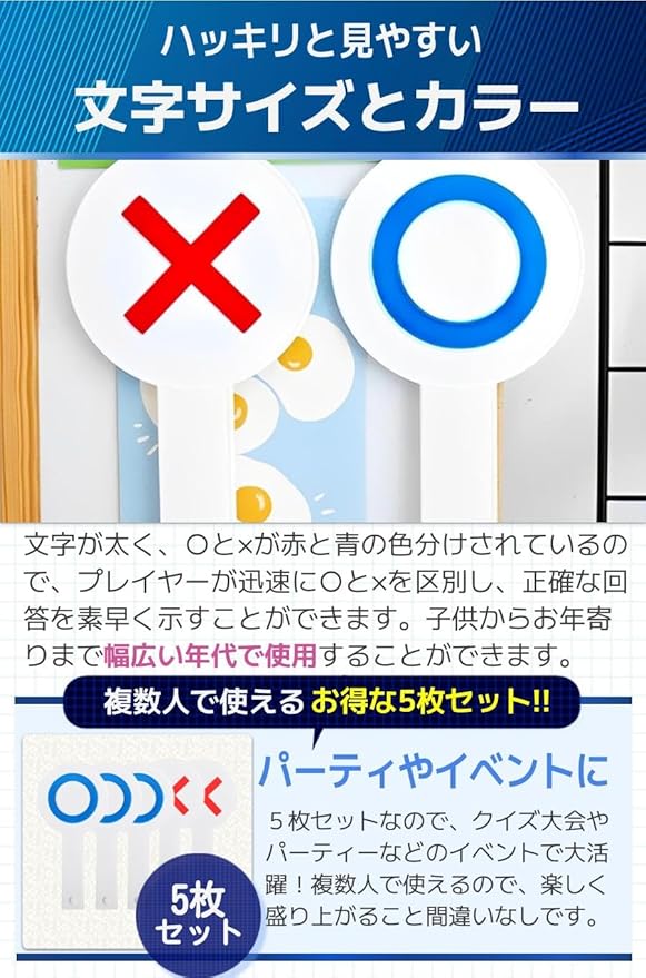 【文字サイズとカラー】文字が太く、〇と が赤と青の色分けされているので、プレイヤーが迅速に〇と を区別し、正確な回答を素早く示すことができます。子供からお年寄りまで幅広い年代で使用することができます。