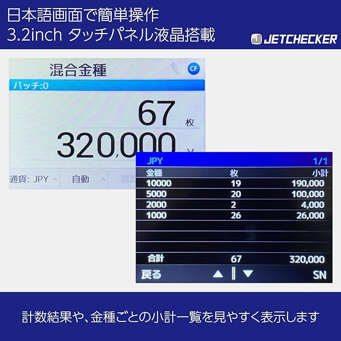 混合金種紙幣を瞬時にカウント、金種別の内訳と合計金額を一覧表示します