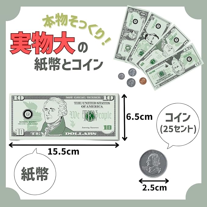 USドルでお金を学ぼう!本物みたいなコインと紙幣のセット。