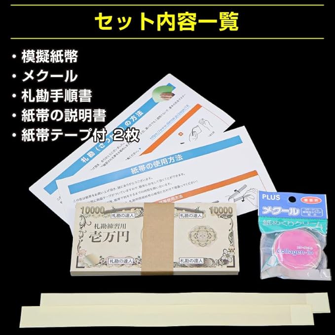 【両面印刷】究極の札勘練習用模擬紙幣セット 紙100枚+メクール1個+紙帯2枚 滑り止め付き(札勘手順書付)