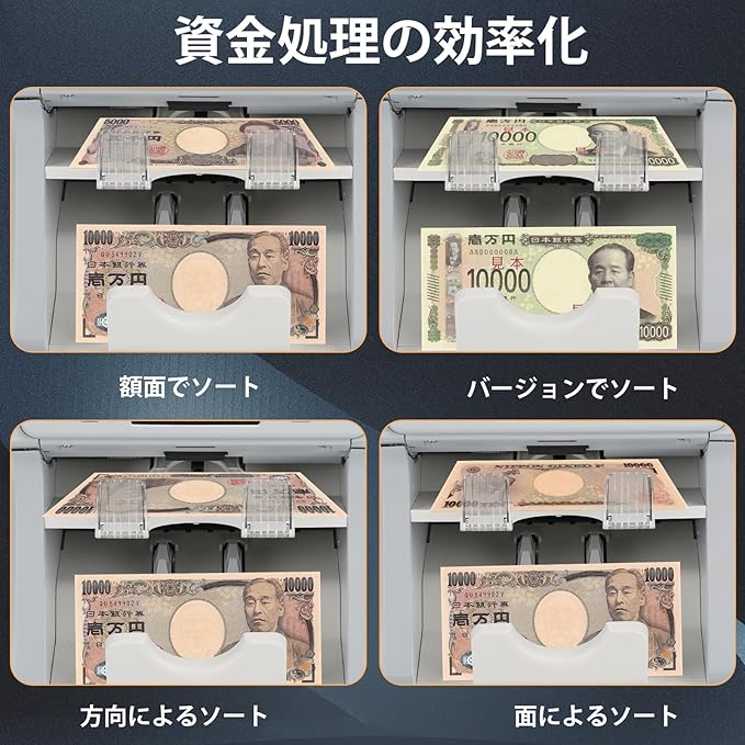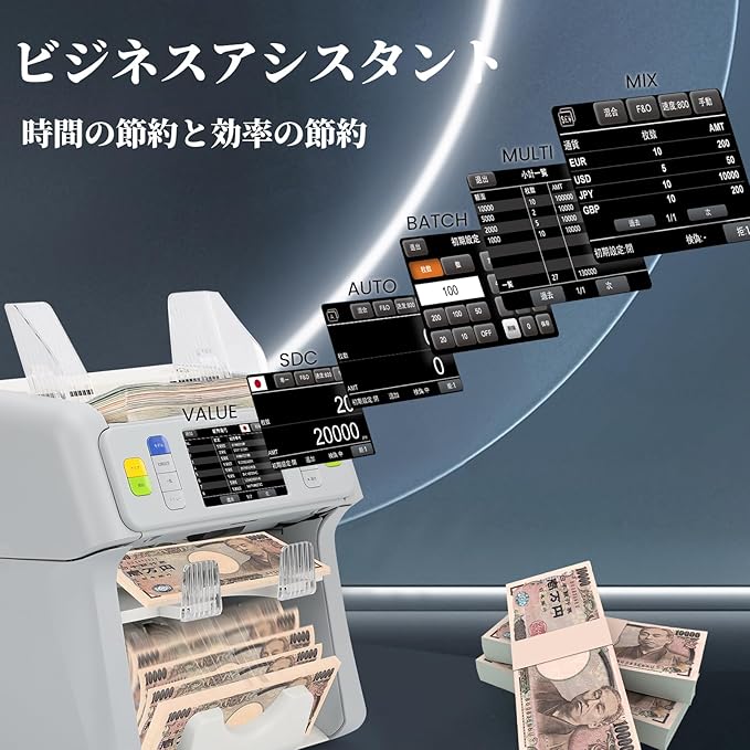 【革新的な偽札検知機能】ダブルCISセンサー、UV、MG、IR、MT、可変インクのセキュリティストリップを搭載。日本円、米ドル、ユーロ、ポンド、カナダドル、メキシコペソのシリアルナンバー認識をサポートしています。