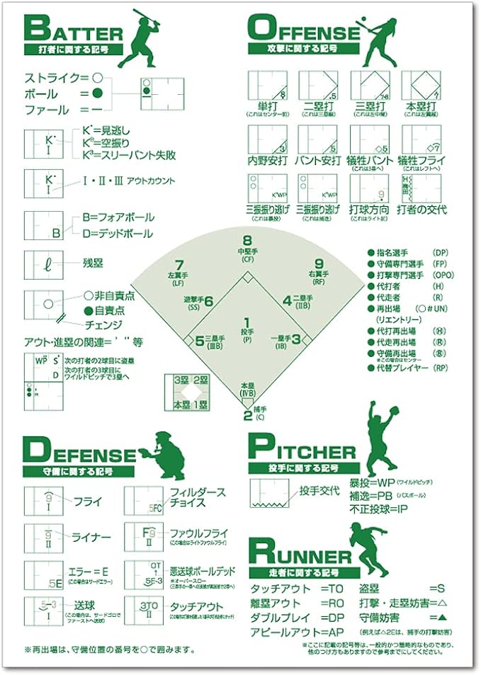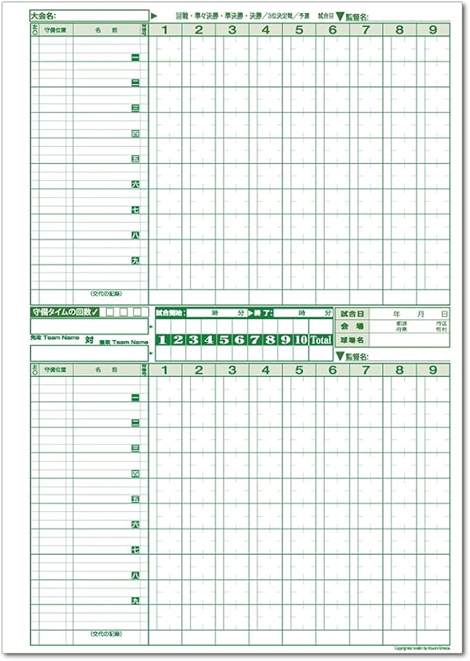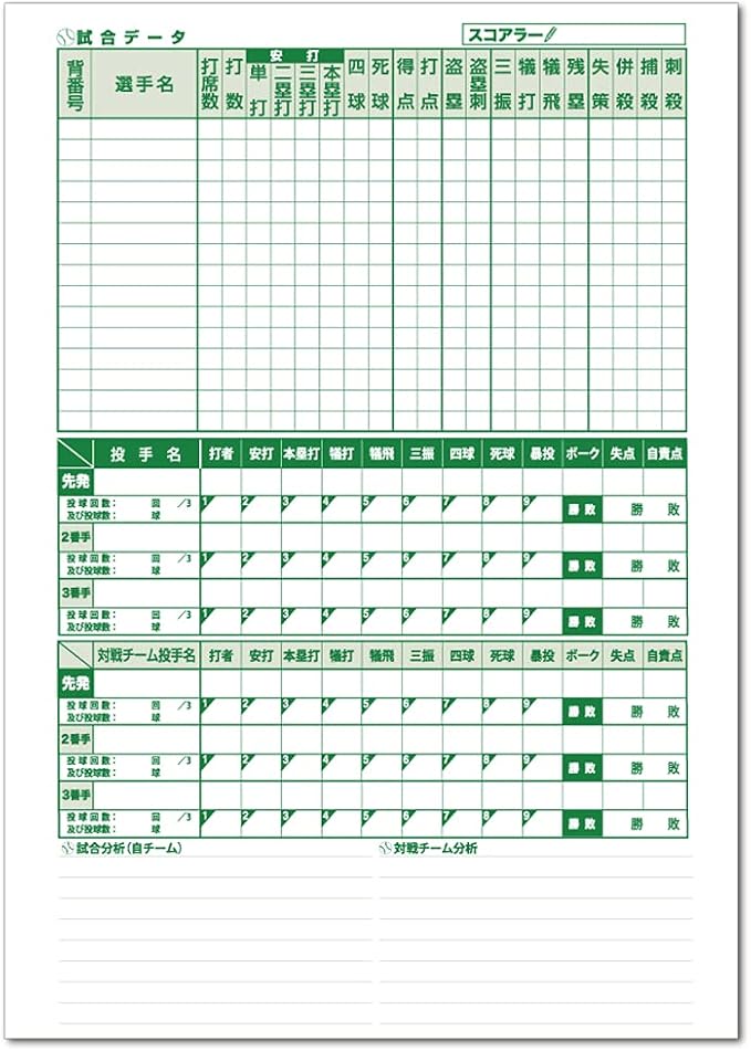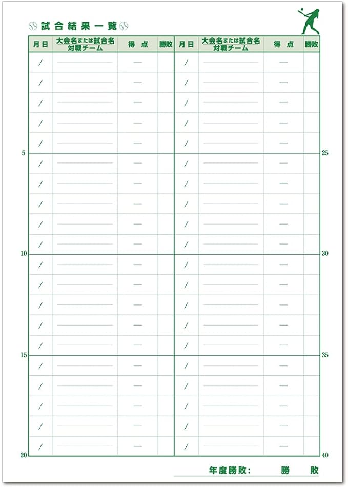 1、35試合分の結果一覧表とスコアブックの付け方の解説書付きです。