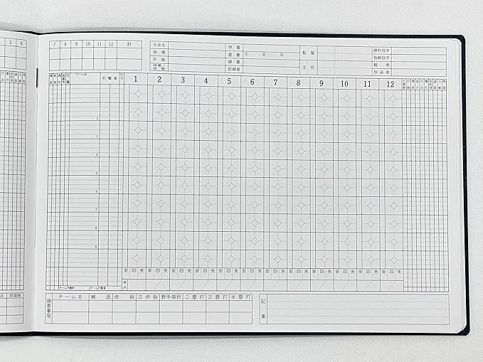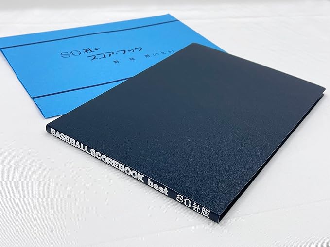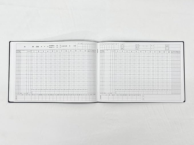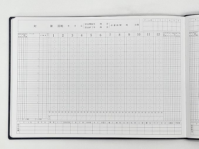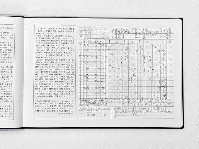 本を開いて左ページに先攻、右ページに後攻チームのプレーを記録していきます。 記入欄の線にはメリハリがあり書込みやすいよう細かな気配りがされています。 繰り返しの書込みに耐える丈夫な紙を使っています。 表紙はダークネイビー ホワイト、落ち着いた雰囲気をもったスコアブックです。 表紙サイズ・縦 横 18.6 26.5(cm)