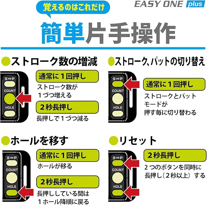 6つの便利機能がそろったデジタルスコアカウンター。ボタン操作も簡単! このスコアカウンターを利用して、快適にラウンドをしてみてはいかがでしょうか。