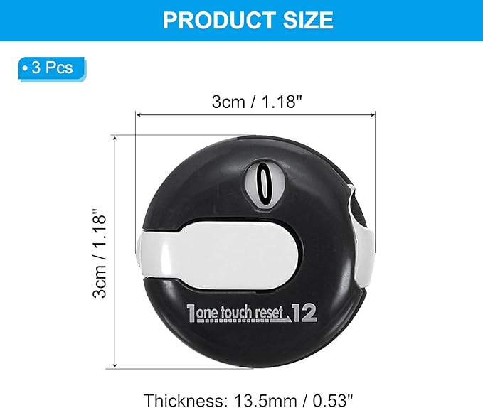カラー:黒;全体サイズ:3 x 3cm / 1.18 x 1.18"(長さ 幅);厚さ:13.5mm / 0.53";パッケージリスト:ミニゴルフスコアカウンター3個