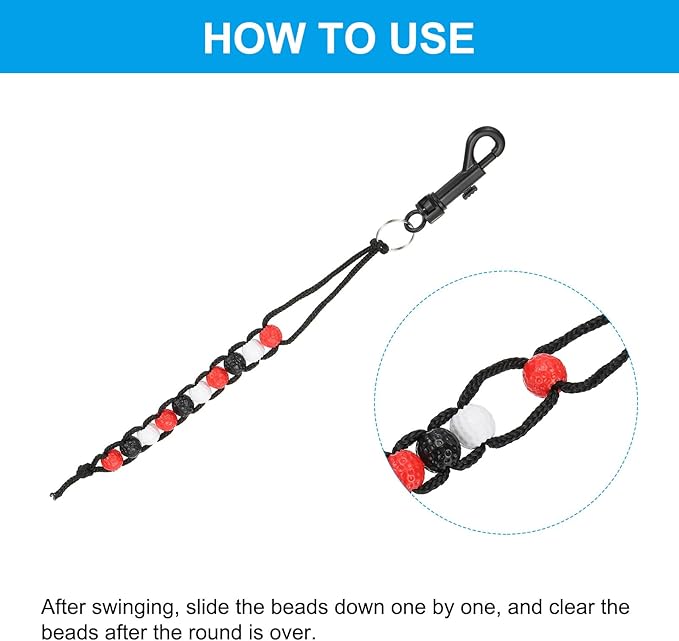 手順:各ビーズはストロークを表し、プレーしたホールごとに、ビーズをストリングに沿ってスライドさせます。ラウンドの終了時に、カウンターに蓄積されたストロークの合計数を記録します。
