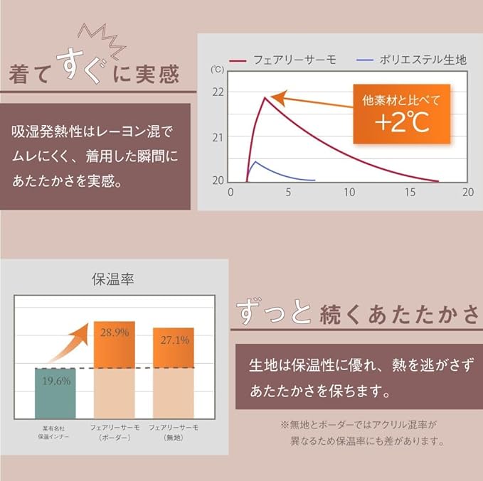 ✅【ポカポカあったか持続】保温性・吸放湿性に優れた、日本製「フェアリーサーモ生地」使用。マイクロアクリルとビスコースレーヨンを掛け合わせたハイブリッド素材が温かさを持続します。
