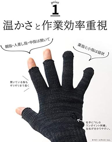 特徴:3つの指だけ開いたハンドウォーマー。温かさと作業効率を重視したらこんな形状になりました。親指、人差し指、中指が開いていて、薬指と小指は袋状です。編み目が大きくゆったり感があります。MとLは横幅がほぼ一緒ですが、Mはやや強めの伸縮糸を入れているのでフィット感があり、手を入れるとMの方がきつめです。