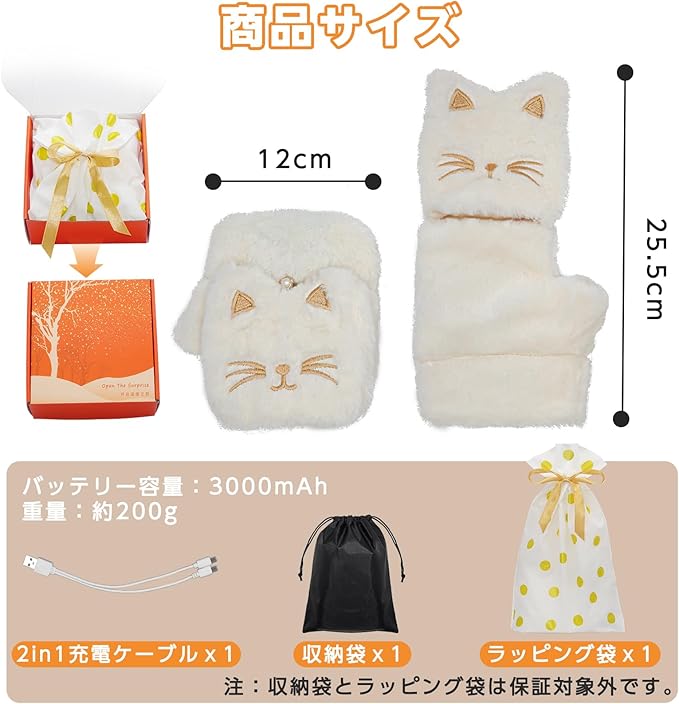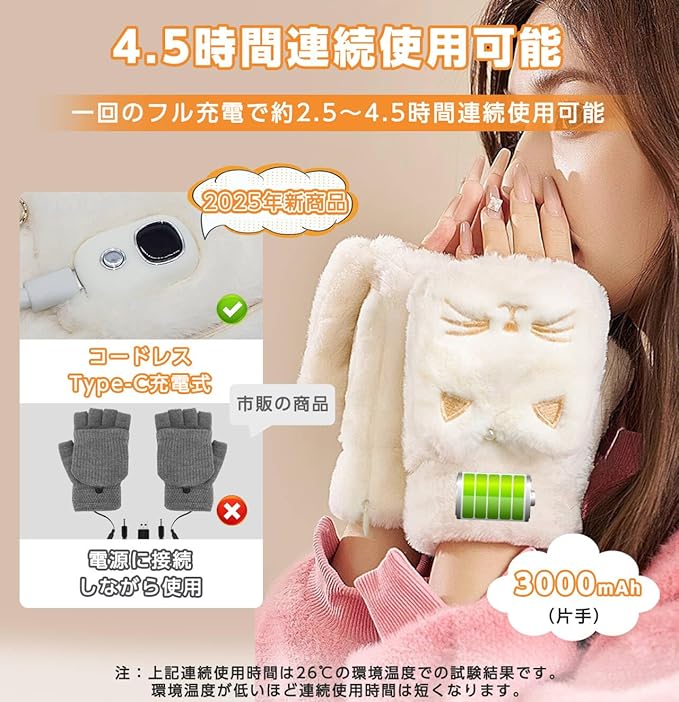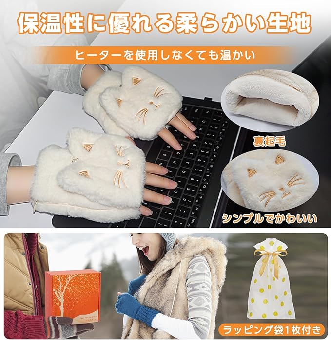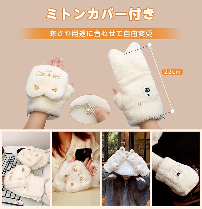 電熱グローブ 電熱手袋 USB充電式 ヒーター手袋 猫柄 3000mAh 5段温度調整 4.5時間連続使用 液晶画面 指なし カバー付き あったか ヒーターグローブ 防寒対策 ハンドウォーマー パソコン作業 デスクワーク 通勤 通学 プレゼント 女性 レディース 猫グッズ 猫モチーフ CT229