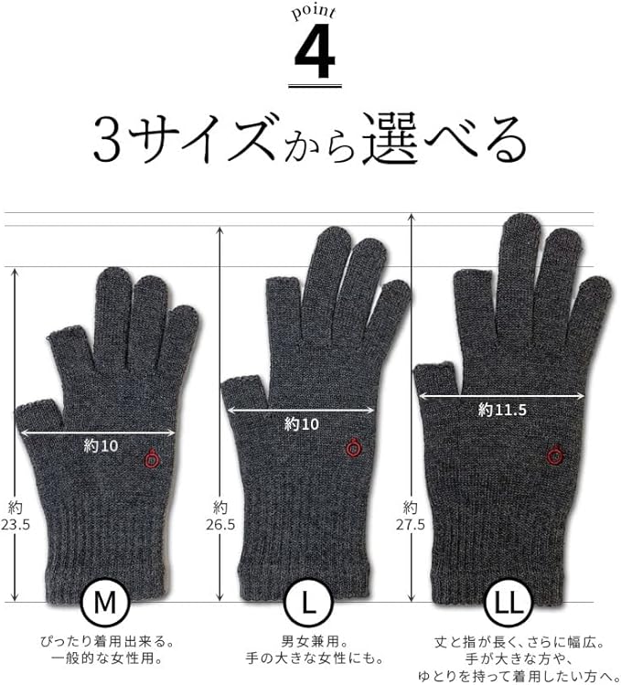 実寸 LL:総丈 27.5、横幅 11.5、親指 3、人差し指 5.5、中指 9、薬指 8、小指 5(手の大きな方用。ゆったり)※いずれのサイズも平置き寸。単位はcm。生産ロット・カラーにより1.5~2センチの差異がございますが、糸が柔らかいので着用するうちに大体同じ大きさに落ち着きます